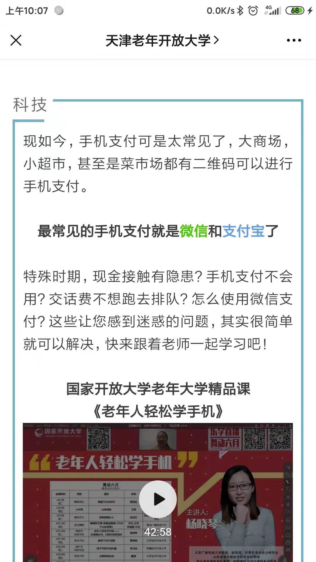 通過微信公眾號定期發布最新的學習資訊和學習資源,采用直播教學、微視頻學習資源和圖文文章相結合,實時陪伴老年人進行數字智能學習。