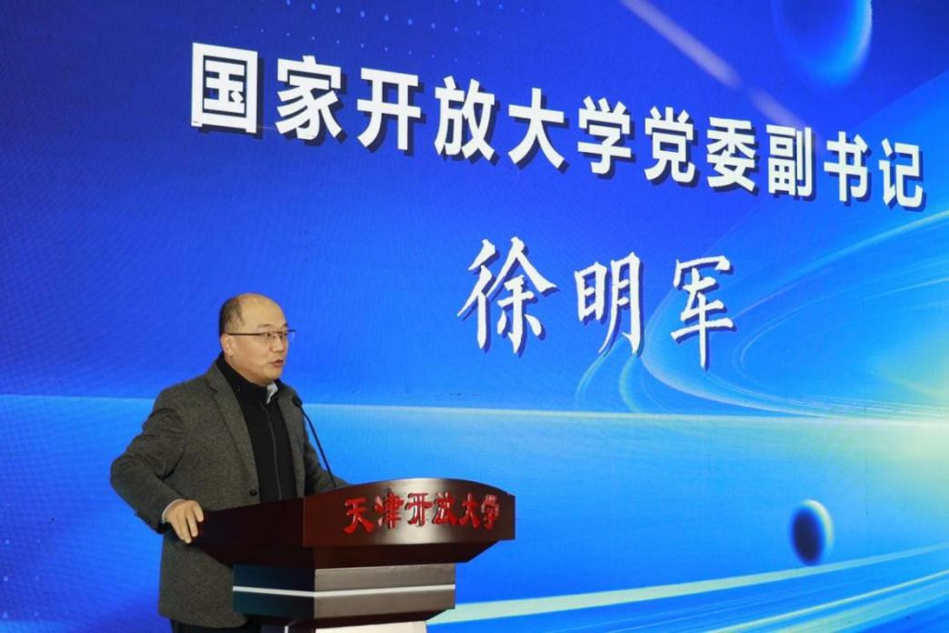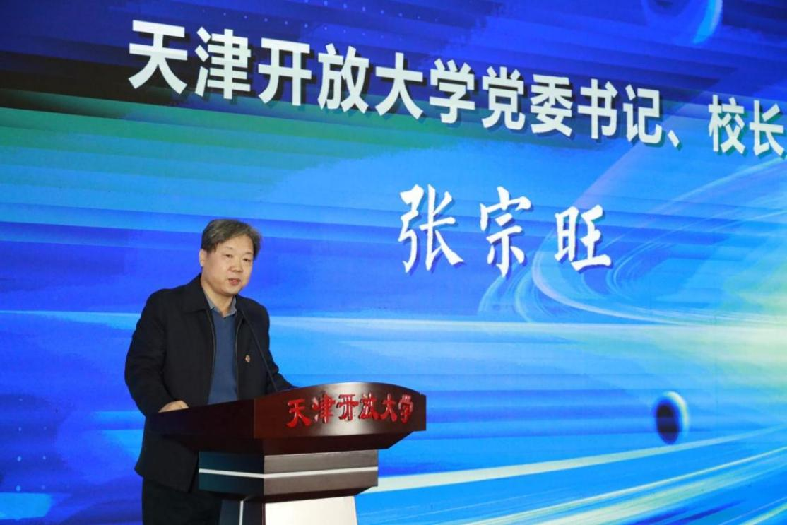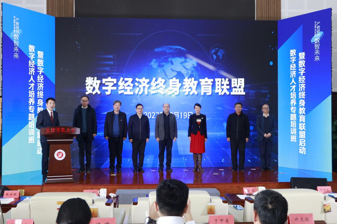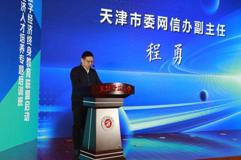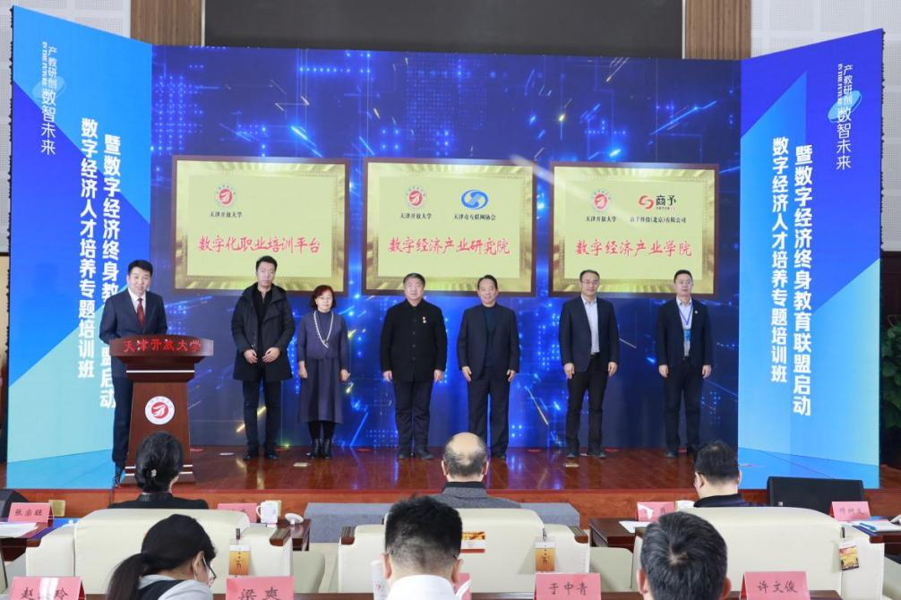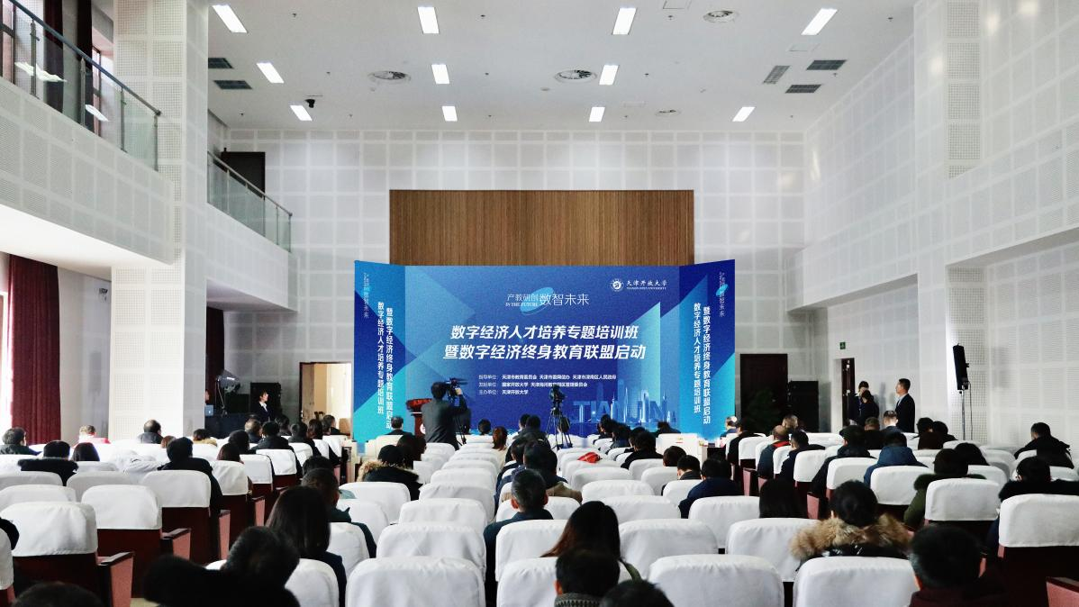 12月19日,“產教研創·數智未來”數字經濟人才培養專題培訓班暨數字經濟終身教育聯盟啟動會在我校海河教育園區成功舉辦。國家開放大學黨委副書記徐明軍,中國電子技術標準化研究院培訓中心主任吳東亞,河北開放大學副校長孫智宏,天津市委教育工委、市教委二級巡視員穆樹發,天津市委網信辦副主任程勇,天津市津南區人民政府副區長劉焱,天津商務職業學院副校長武春平,我校黨委書記、校長張宗旺,黨委副書記王剛清出席聯盟啟動會,來自全國70余家單位的150余名相關人員參加了專題培訓班。啟動會由海河教育園區管委會副主任李冬凱主持。