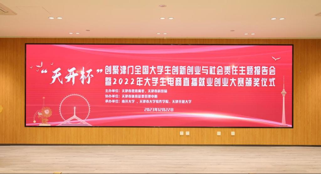 12月22日下午,“天開杯”創聚津門全國大學生創新創業與社會責任主題報告會暨2022年大學生電商直播就業創業大賽頒獎儀式在天開高教科創園報告廳舉行。本次活動由市教育兩委和市科技局主辦,由我校和南開大學、天津市大學軟件學院承辦。市委教育工委專職副書記孫志良出席會議并講話,我校黨委書記、校長張宗旺出席。全市各高校分管負責同志、市教委相關處室負責同志、獲獎師生代表等150余人參加。