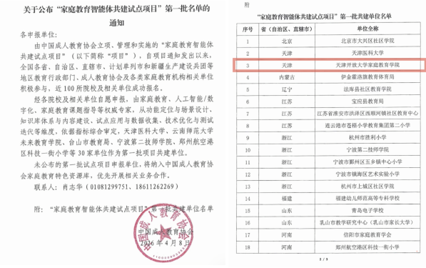 近日,中國成人教育協會揭曉“家庭教育智能體共建試點項目”首批共建單位,我校家庭教育學院成功入選,成為全國30家首批共建單位之一。