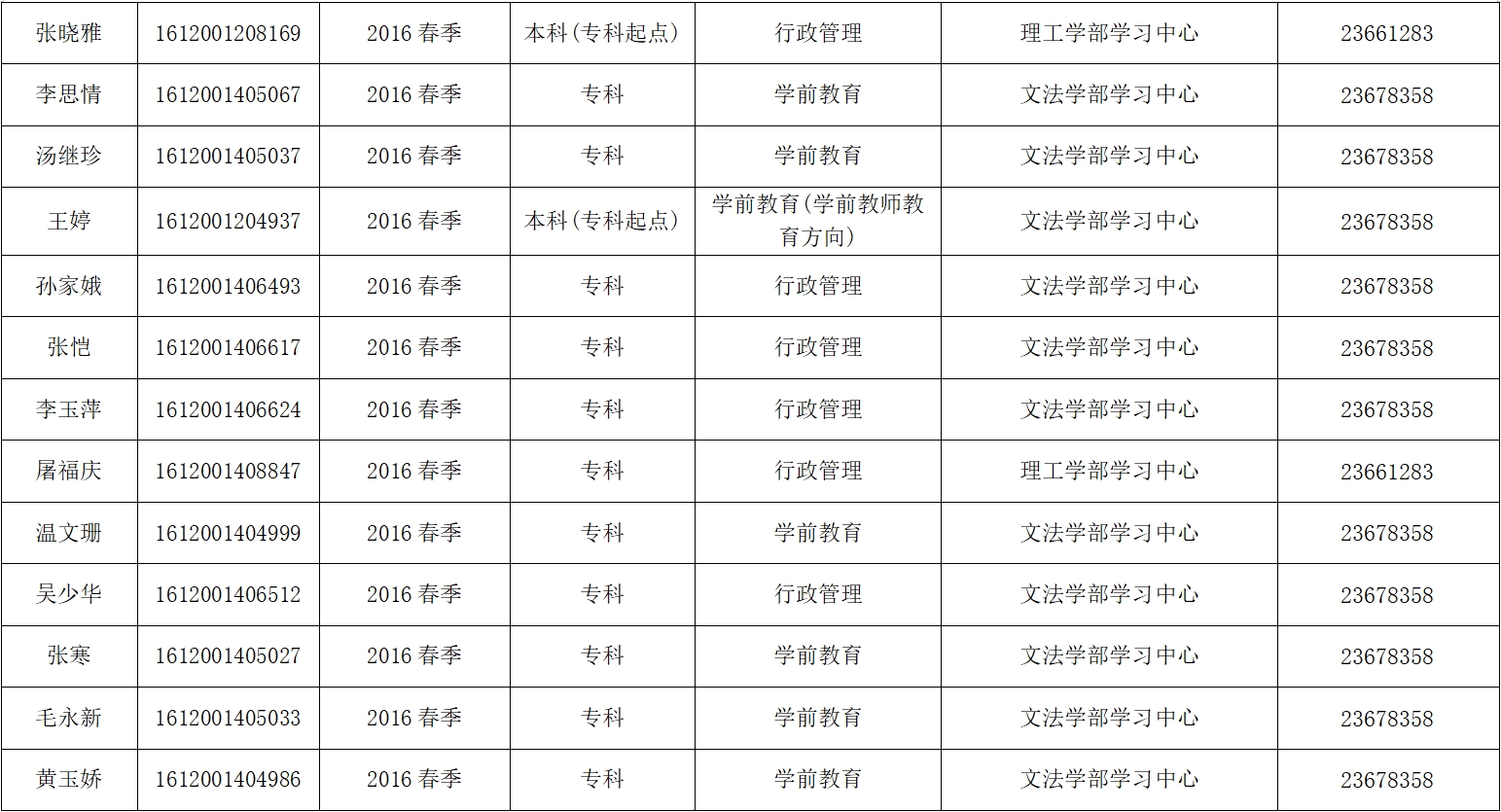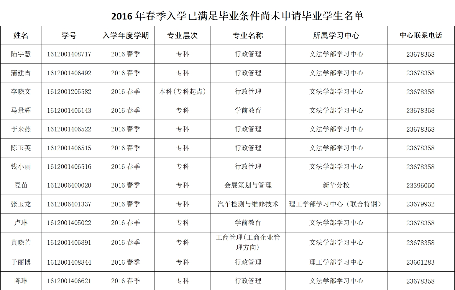 陸宇慧等26位同學(名單附后)于2016年春季入學,至2024年3月底,學籍即將達到8年有效期。26名同學各科成績已滿足畢業條件,因缺少學歷照片尚達不到畢業要求。請陸宇慧等26位同學抓緊聯系所屬學習中心,務必在3月31日前完成畢業生圖像采集工作,介時未完成的將失去畢業資格,學籍自行終止。