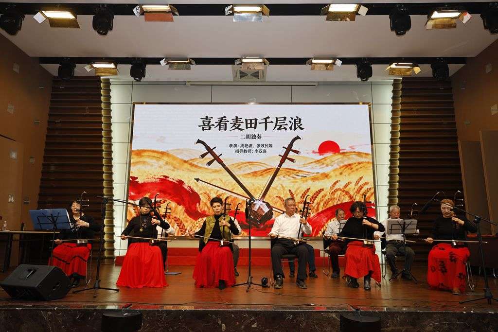 學校特聘朗誦專業教師彭詩寬擔綱本次文藝匯演主持人,深厚的專業功底與親和的主持風格,為整場演出增添了別樣光彩。文藝匯演在市校師生帶來的吉他合奏《愛的羅曼斯》中拉開序幕,悠揚的旋律瞬間點燃現場氛圍。大港分校朱珠的女聲獨唱《看見你們格外親》情真意切。市校學員演繹的太極扇《舞動韶華》剛柔并濟,展現出老年人的活力與風采。朗誦《大堰河,我的保姆》情感飽滿、催人奮進。西青分校的空靈鼓表演《荷塘月色》意境悠遠。紅橋分校的二胡合奏《喜看麥田千層浪》洋溢著豐收的喜悅。
