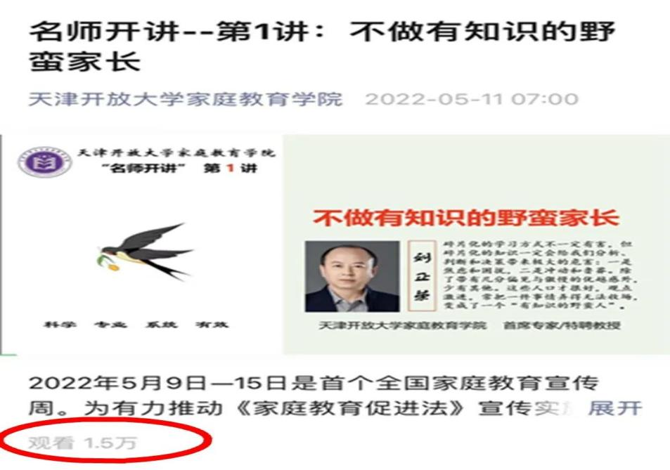 課程自2022年5月起每周二在“天津開放大學家庭教育學院”微信公眾號播出,內容涵蓋親子關系、溝通方式、假期規劃、學習方法、生涯教育、自我管理等家庭教育理論實踐知識。目前,活動已經播出《不做有知識的野蠻家長》《對孩子發火的潛意識是對自己父母的反抗》《讓孩子在探究中成長》等五期,受眾人數超4萬人。課程用生動的案例深入淺出地講解教育方法,引發家長反思,進而避免決策失誤造成育兒中的焦慮和困擾,深受家長朋友喜愛,獲得業內好評。