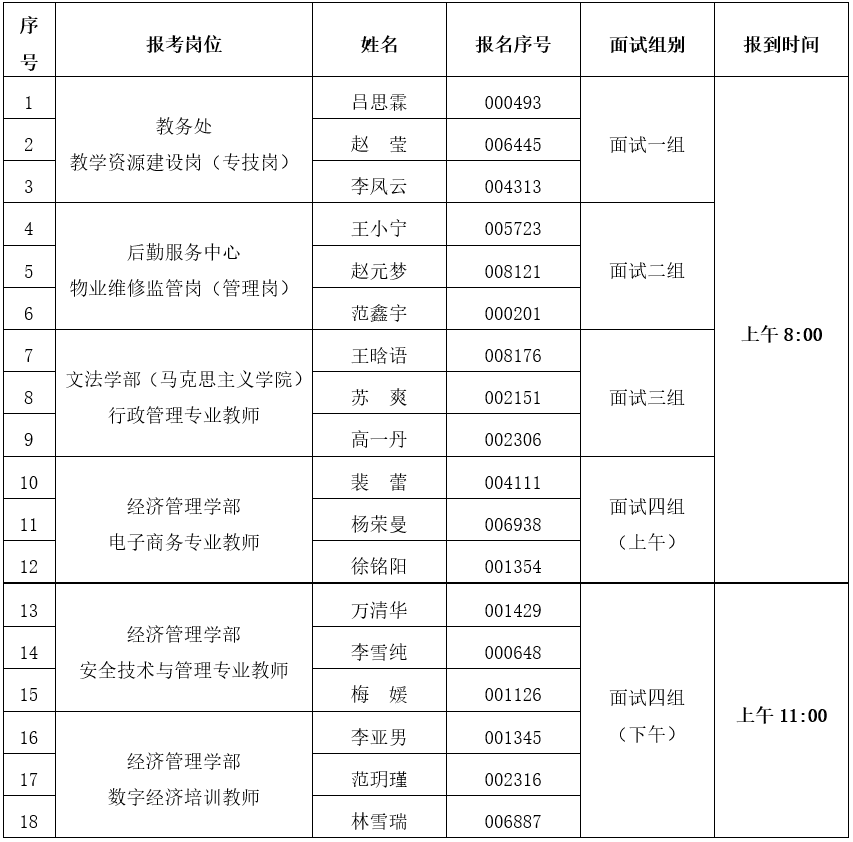 (三)請報考教學資源建設崗(專技崗)、物業維修監管崗(管理崗)、行政管理專業教師、電子商務專業教師的考生于上午8:00,報考安全技術與管理專業教師、數字經濟培訓教師的考生于上午11:00持二代居民身份證、面試準考證到1號樓三層301教室(候考室)報到。按照工作人員的安排進行驗證抽簽,缺少任一證件不得參加面試。