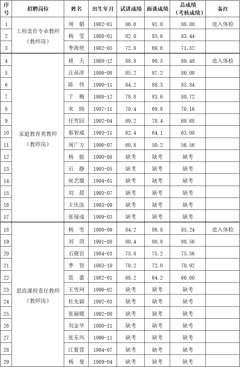 說明:考核成績按試講成績占60%、面談成績占40%的比例合成。試講和面談成績滿分均為100分,保留1位小數。考核成績即為總成績,滿分為100分,保留2位小數。