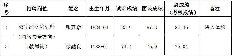 說明:考核成績按試講成績占60%、面談成績占40%的比例合成。試講和面談成績滿分均為100分,保留1位小數??己顺煽兗礊榭偝煽?,滿分為100分,保留2位小數。
