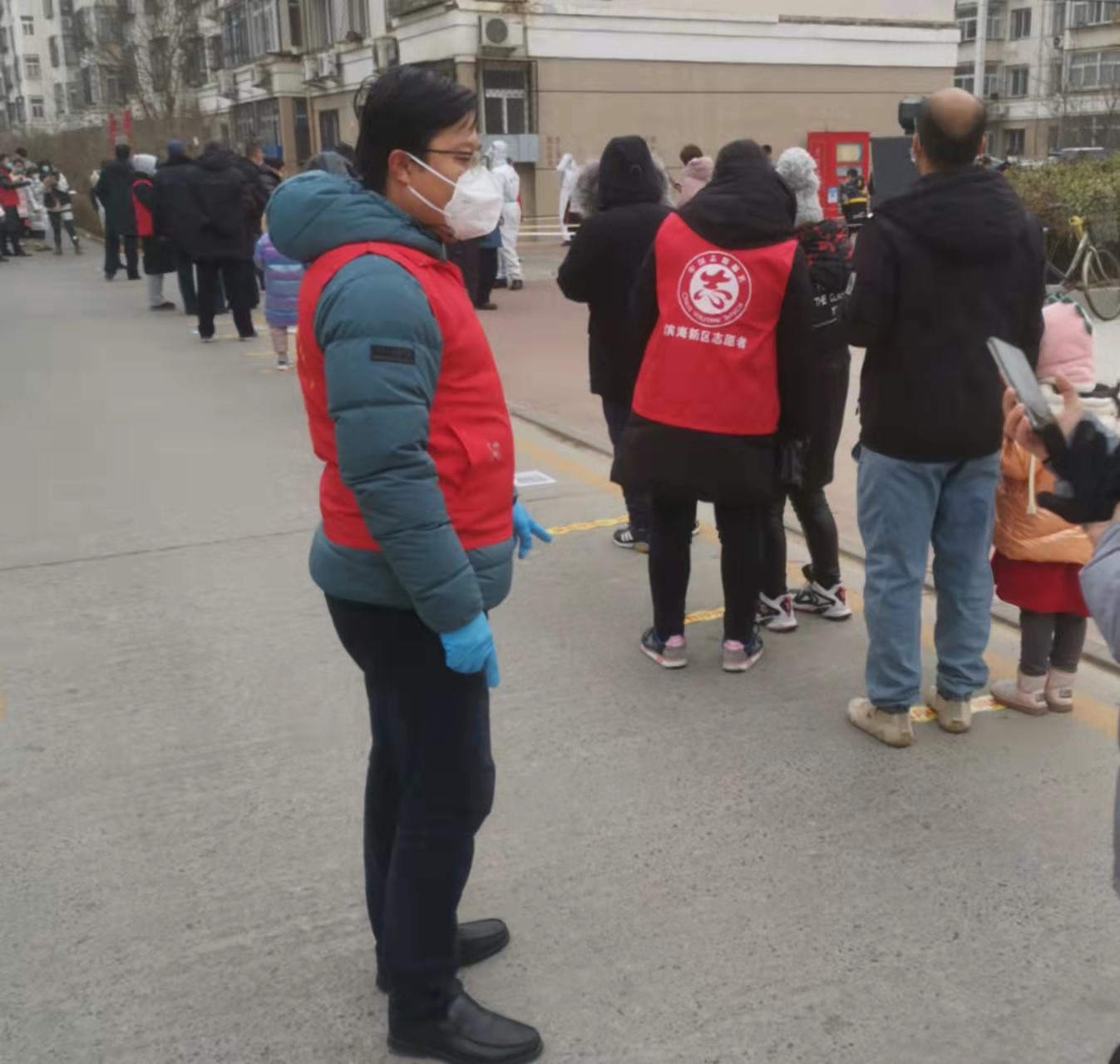 1月12日,民盟盟員趙寶磊老師參加了濱海新區晨暉北里社區第二次核酸篩查志愿服務,主要負責維持現場秩序,通知引導居民掃碼登記信息。在冬日寒風中,他幫助眼花和不會使用智能手機的老年人完成信息登記,通過協調居委會和排隊群眾,為腿腳不方便的老年人和孕婦開辟了免排隊綠色通道,為特殊群眾提供了便捷和溫暖,保障小區核酸篩查順利進行。