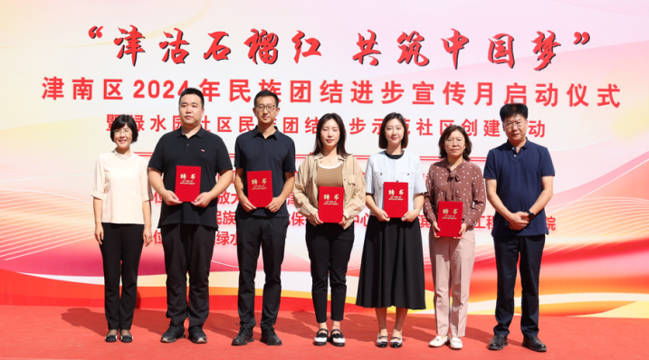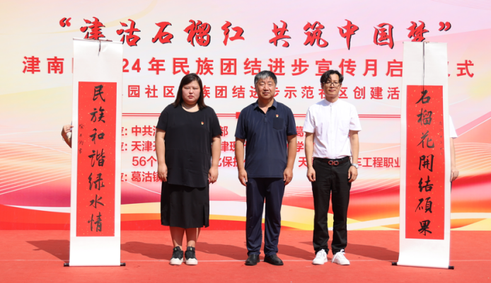 9月6日,津南區委統戰部、葛沽鎮黨委主辦,我校與相關單位協辦,津南區2024年民族團結進步宣傳月啟動儀式暨綠水園社區民族團結進步示范社區創建活動在葛沽鎮綠水園社區舉辦,黨委副書記王剛清和學校少數民族教職工出席活動。大家集體觀看了文藝演出,參觀了56個民族非遺文化保護傳承中心展示和綠水園社區“紅石榴”特色展廳。文法學部(馬克思主義學院)思政教師王燕珺、宮帥帥、康美玲現場受聘為津南區鑄牢中華民族共同體意識宣講員。校民盟支部主委、老年大學教師徐子鈞書寫“石榴花開結碩果,民族和諧綠水情”書法作品,贈予綠水園社區。
