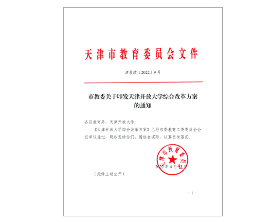 2022年4月13日,天津市教育委員會印發《天津開放大學綜合改革方案》。這是為落實教育部《關于印發國家開放大學綜合改革方案的通知》(教職成〔2020〕6號)和我市《天津市人民政府關于同意天津廣播電視大學更名為天津開放大學的批復(津政函【2020】170號)要求,加快推進天津開放大學轉型發展而采取的一項重要措施。