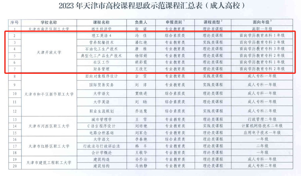 近日,市教委發布了《關于公布2023年天津市高校課程思政示范課程認定結果的通知》(津教繼教函〔2024〕15號),我校組織申報的《理工英語4》等6門課程全部獲批市級課程思政示范課程,獲認定課程門數位列獨立設置成人高校第一。