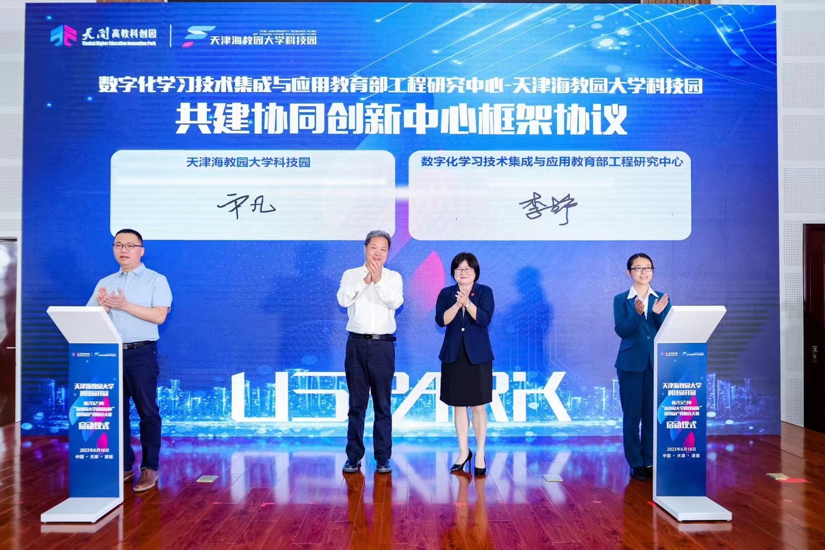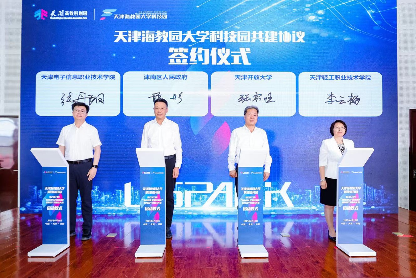 現場首次發布了天津海教園大學科技園宣傳片。我校資產經營有限公司董事長平凡介紹了園區的基本情況。我校與津南區、天津電子信息職業技術學院、天津輕工職業技術學院簽署區校共建協議。國家開放大學“數字化學習技術集成與應用中心”與海教園大學科技園簽署“數字化學習技術集成與應用協同創新中心”共建協議。海教園大學科技園與北京新大陸時代科技有限公司等6家企業和天津北洋海棠創業投資管理有限公司等3家投資機構簽約。入駐企業代表發言。