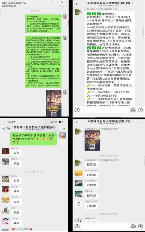 作為活動的亮點,西青開放大學與西青區老年大學的“雙員聯動”,打破了傳統教育的年齡壁壘,成功構建了一個“老少同堂、智慧共享”的線上共學平臺?;顒硬捎帽憬莸摹皢柧硇恰本€上答題形式,內容涵蓋黨史、抗戰史及新中國發展歷程。學員們在答題中學習,在競賽中感悟。這種創新的形式打破了時空與年齡的界限,讓不同人生閱歷的學員在共同的主題下交流碰撞,真正實現了“知識育人、促進共學”的目標。